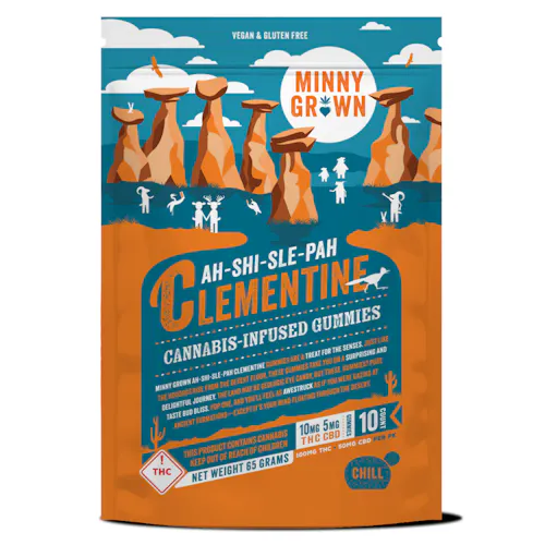 Ah-Shi-Sle-Pah Clementine 10-count gummies. 10mg THC and 5mg CBD per serving. 100mg THC and 50mg CBD per package. Vegan & Gluten Free.